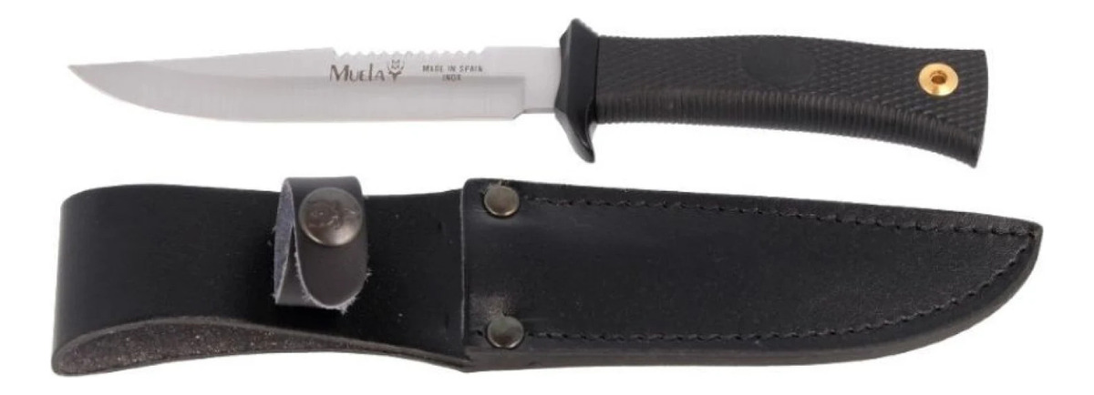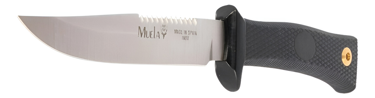 Cuchillo de caza compacto diseñado para uso en exteriores. El cuchillo de cuchilla fija Muela mide 22 cm en total y cuenta con una cuchilla de 12 cm fabricada en acero inoxidable de molibvanadio serie 420A. La manija de goma Kraton negra viene con un protector de dedos de metal negro y un orificio para cordón. Una funda de cuero marrón con cierre de botón a presión y cinturón.