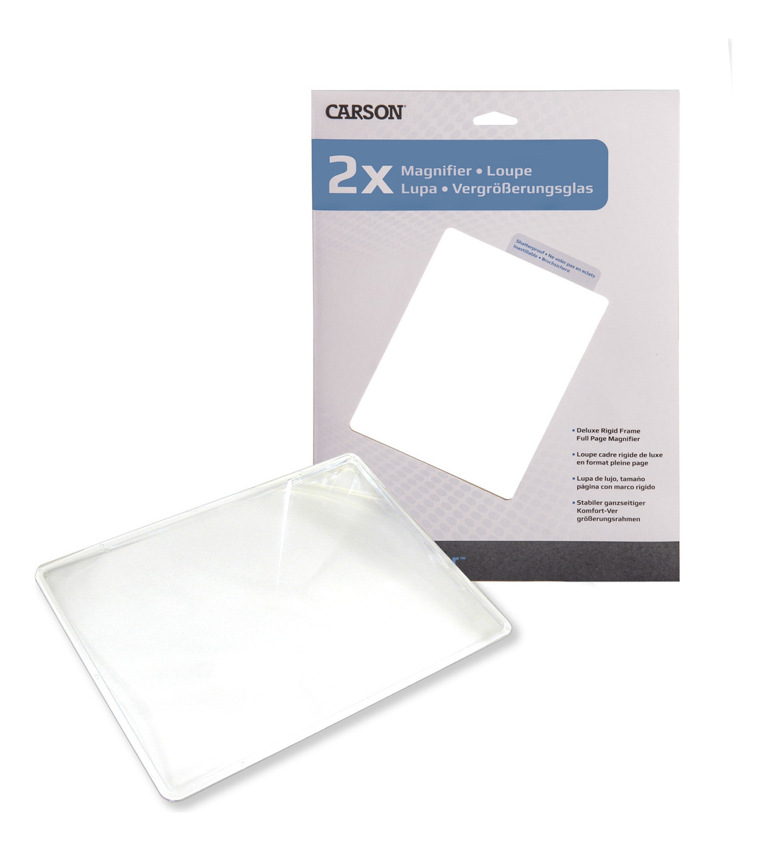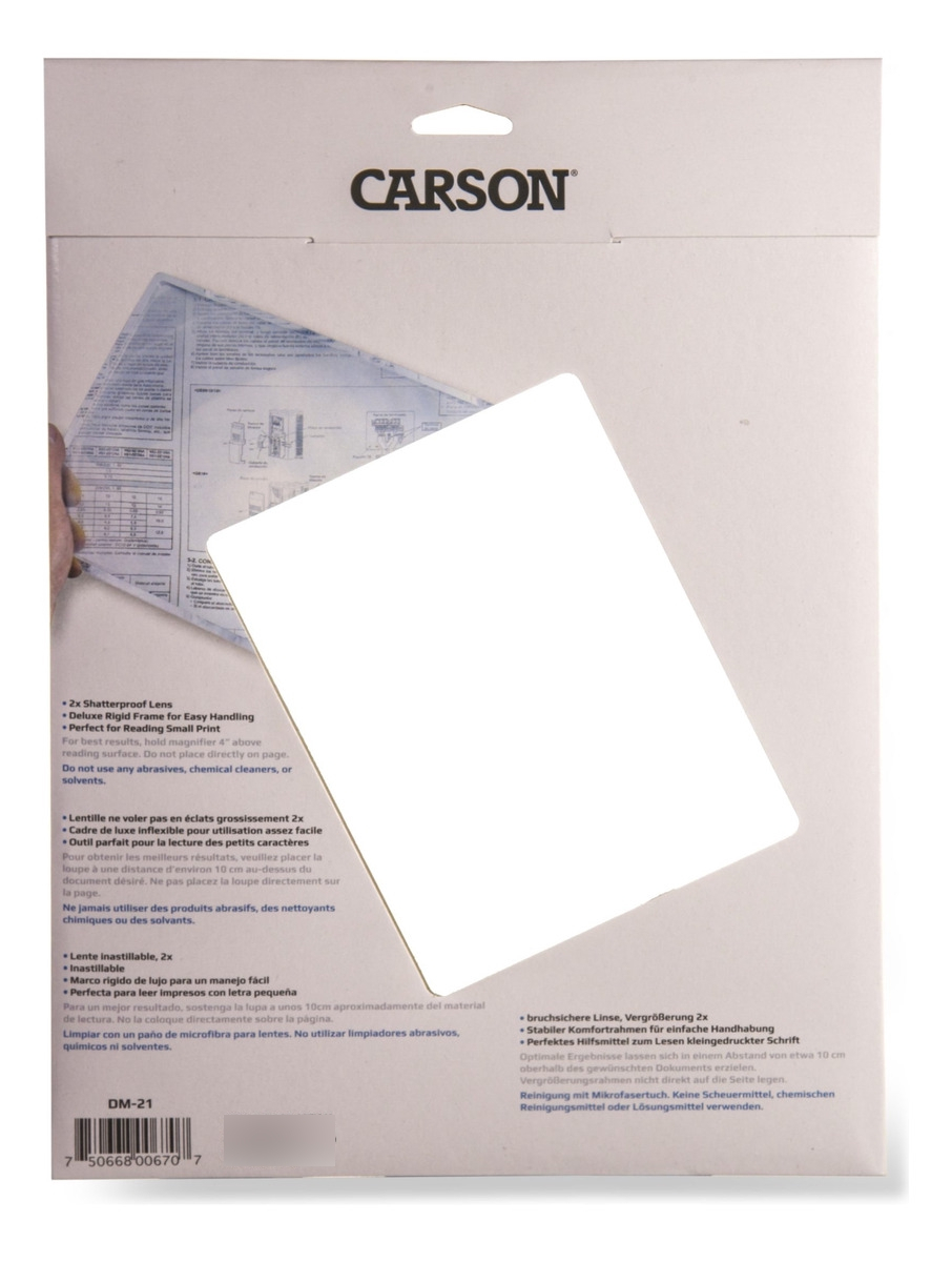 La lupa en forma de lamina Page Magnifier DM-21 de Carson es una lupa de lujo, tamaño página con marco rígido. Su lente acrílica tipo Fresnel, con aumento de 2x, es resistente e inastillable. La lupa en forma de lamina Page Magnifier es perfecta para leer grandes áreas con letras pequeñas, tales como mapas, periódicos, guías telefónicas, recetas y más.Para usarla, sostenga la Page Magnifier a unos 10cm aproximadamente del material de lectura. Esta lupa es tan delgada y se puede guardar dentro del material de lectura.
