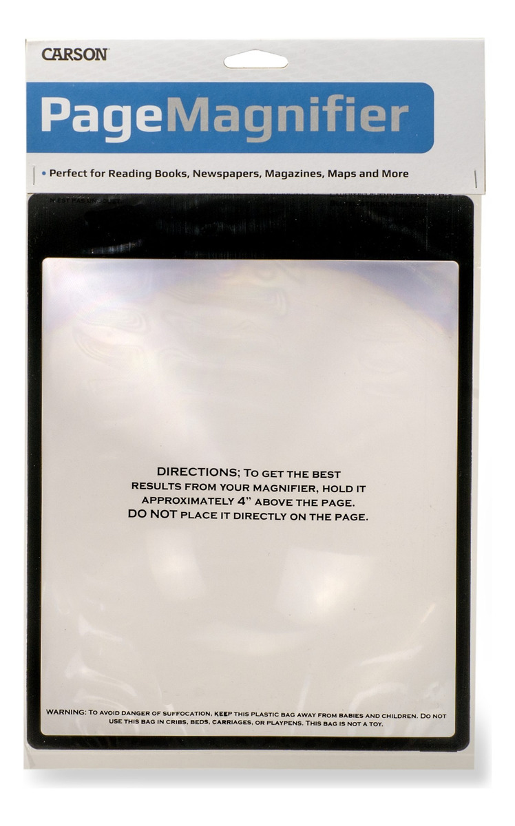 La lupa MagniSheet, DM-11 de Carson es una lupa tipo Fresnel en forma de lámina de pagina entera. Es flexible con aumento de 2x, emarcado de color negro, delgada, liviana y fácil de transportar. Para usarla, sostenga la MagniSheet a unos 10cm aproximadamente de su objetivo. Esta excelente lupa 2x en lámina, tamaño página, es una excelente ayuda para leer libros, periódicos, revistas, mapas, inspección, pasatiempos, manualidades y otras tareas.