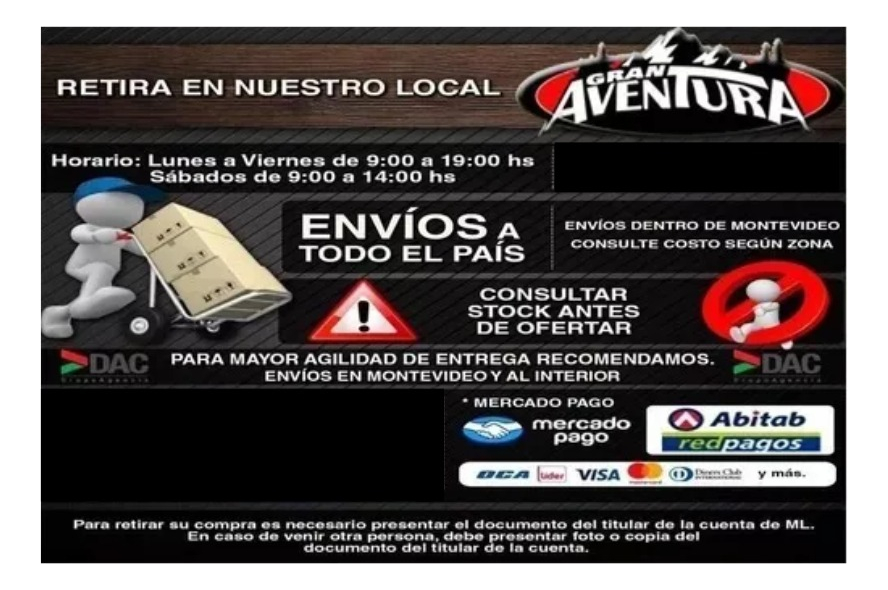 ENVÍOS: Hacemos envíos a todo el país por la agencia DAC , si utilizas la opción mercado envíos va únicamente por agencia UES