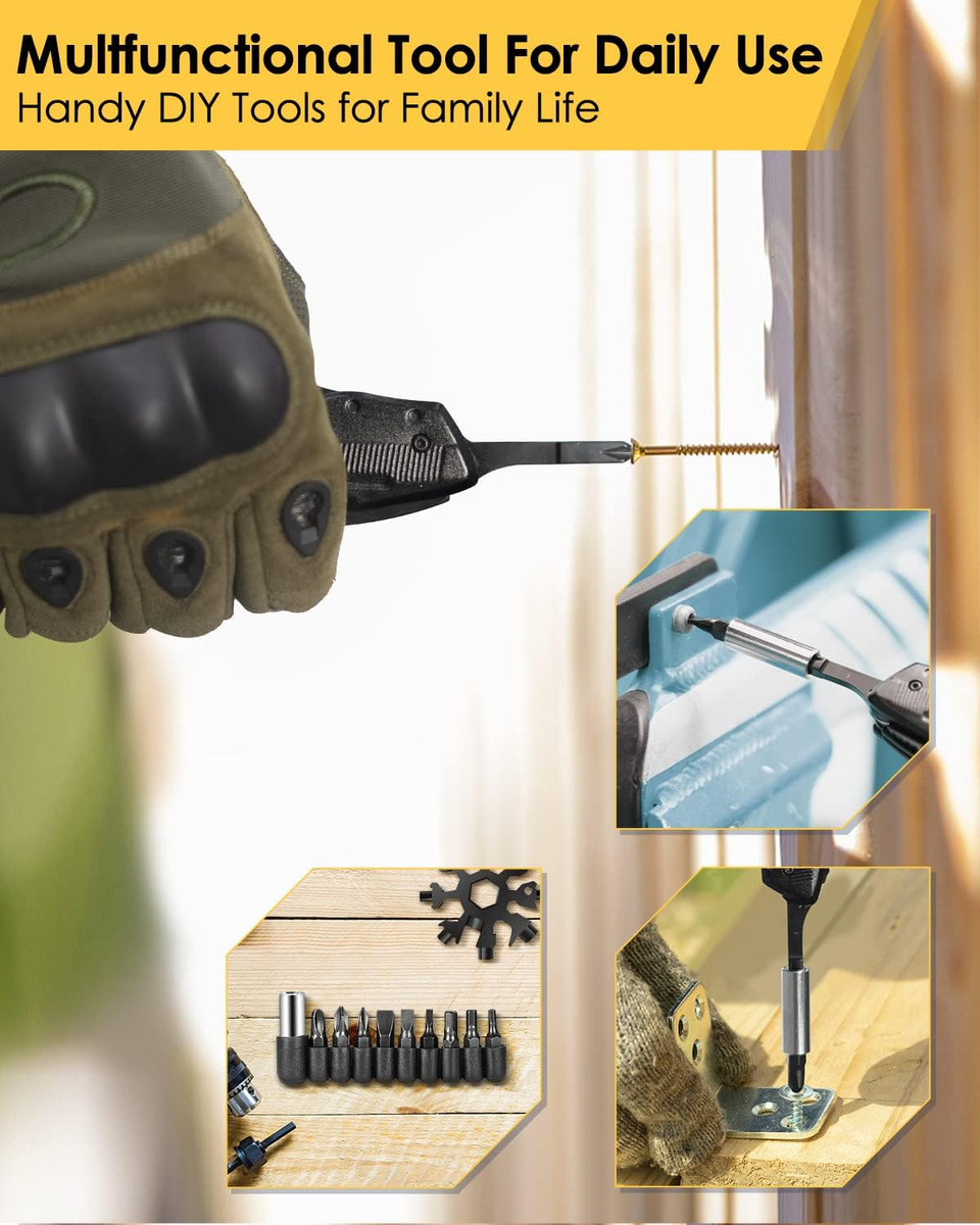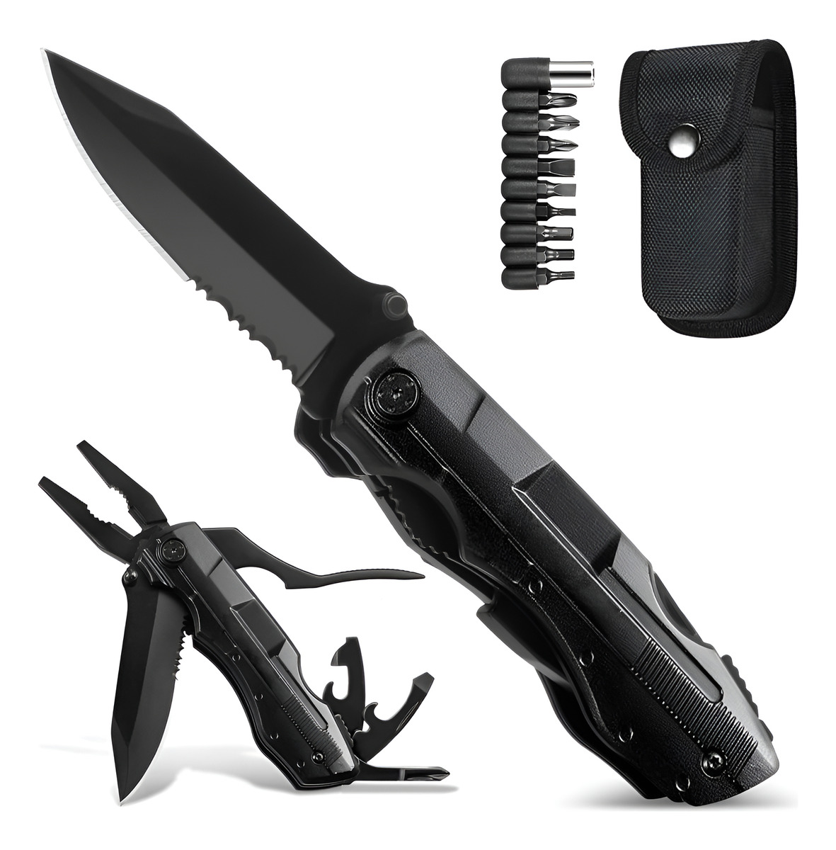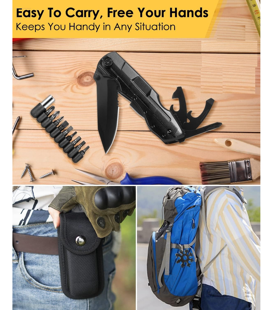 Navaja suiza Multper con cuchillo/hoja de sierra, alicates, abrelatas, abridor de botellas y un juego de destornilladores de 9 posiciones. ¡El inteligente diseño plegable le permite ahorrar aún más espacio! Ya sea bricolaje, deportes al aire libre, camping o senderismo, la navaja multiherramienta es su ayudante perfecta.